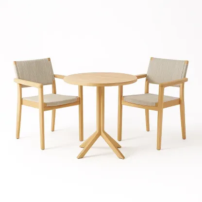 Petit ensemble bistrot de terrasse avec table ronde en bois massif et deux chaises en polyester